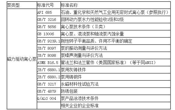 六、泵的設(shè)計(jì)、制造、檢驗(yàn)應(yīng)符合有關(guān)標(biāo)準(zhǔn)、規(guī)范的規(guī)定,常用磁力驅(qū)動(dòng)離心泵的類型、標(biāo)準(zhǔn)代號(hào)及標(biāo)準(zhǔn)名稱見(jiàn)表1。