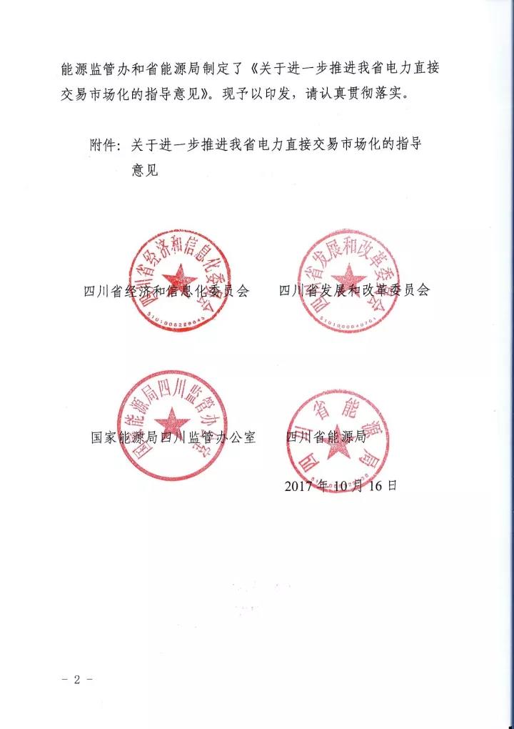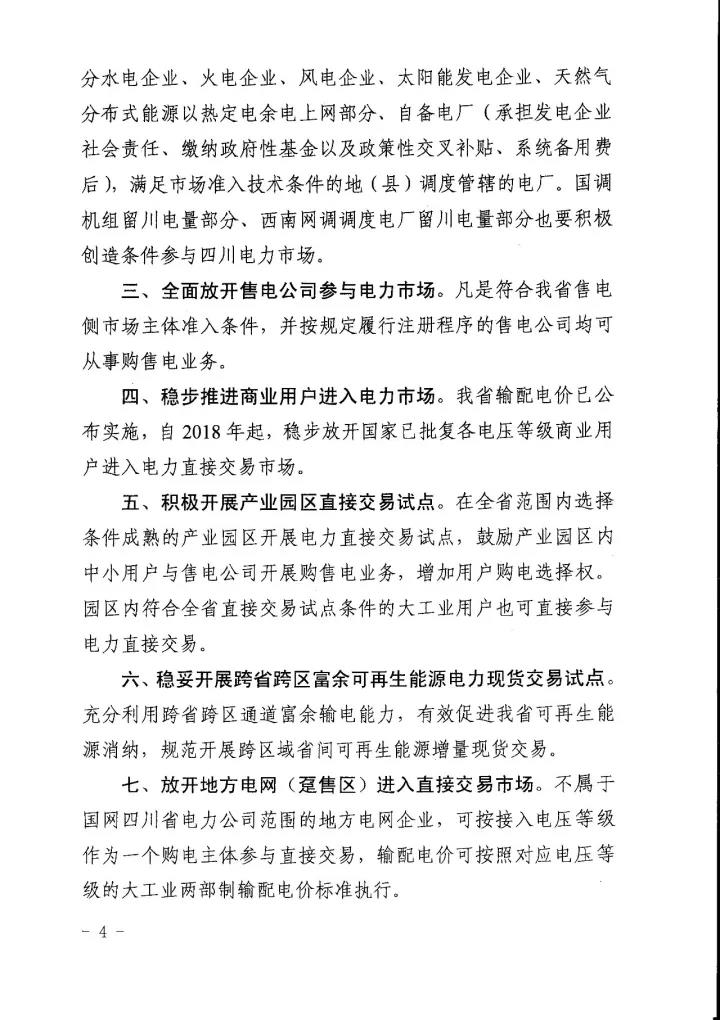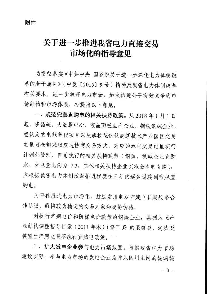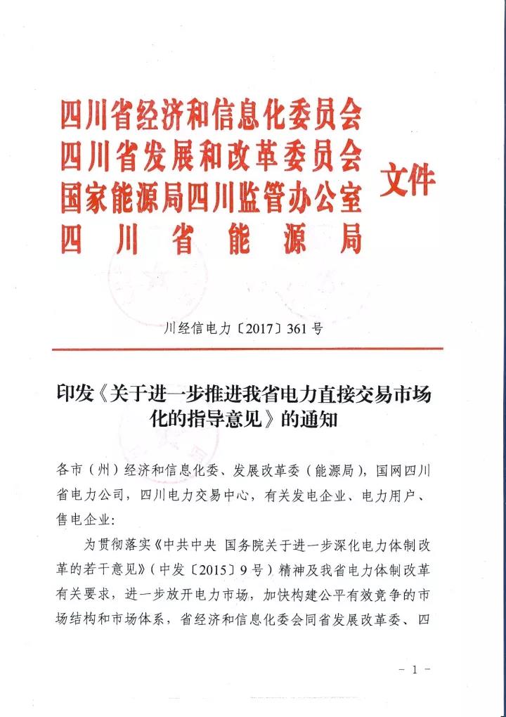 四川省經(jīng)信委、四川省發(fā) 改委、國家能源局四川監(jiān)管辦、四川省能源局日前聯(lián)合下發(fā)了《關(guān)于進一步推進我省電力直接交易市場化的指導意見》(以下簡稱“意見”)。意見中稱,將規(guī)范完善直購電的相關(guān)扶持政策,擴大發(fā)電企業(yè)參與電力市場范圍,全面放開售電公司參與電力市場,穩(wěn)步推進進商業(yè)用戶進入電力市場,積極開展產(chǎn)業(yè)園區(qū)直接交易試點,穩(wěn)妥開展跨省跨區(qū)富余可再生能源電力現(xiàn)貨交易試點,放開地方電網(wǎng)(躉售區(qū))進入直接交易市場,有序推進其他特殊行業(yè)企業(yè)完全電力市場化。詳情如下: