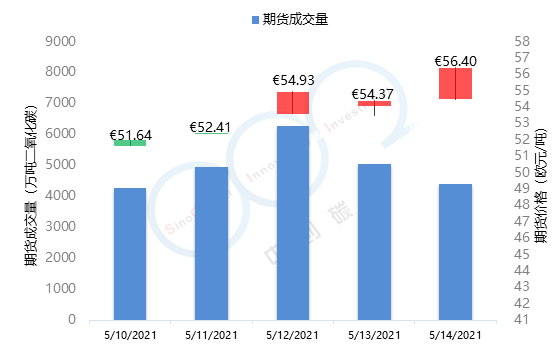 - 2021年5月10日至5月14日,由于歐盟碳市場(chǎng)投資者的強(qiáng)勢(shì)買(mǎi)盤(pán)以及歐盟氣候負(fù)責(zé)人對(duì)于歐盟碳價(jià)較為消極的干預(yù)政策,歐盟碳價(jià)在本周再次呈現(xiàn)較大漲幅并接連刷新記錄,由51.64歐元/噸上漲至56.40歐元/噸,漲幅達(dá)9.22%。