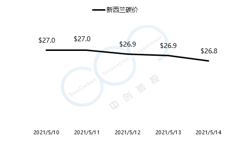 2021年5月10日至5月14日,新西蘭碳價(jià)由27.0美元/噸一路跌至26.8美元/噸。