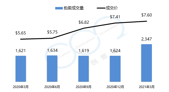 RGGI碳市場(chǎng)的初始配額發(fā)放以拍賣(mài)為主,每個(gè)季度舉行一次拍賣(mài)。2021年第一季度拍賣(mài)成交均價(jià)為$7.60美元,較上一季度漲幅為2.5%。由于弗吉尼亞州的加入,RGGI總成交量創(chuàng)歷史新高,達(dá)到了2347萬(wàn)噸。以下是由中創(chuàng)碳投統(tǒng)計(jì)的RGGI近一年的交易情況。