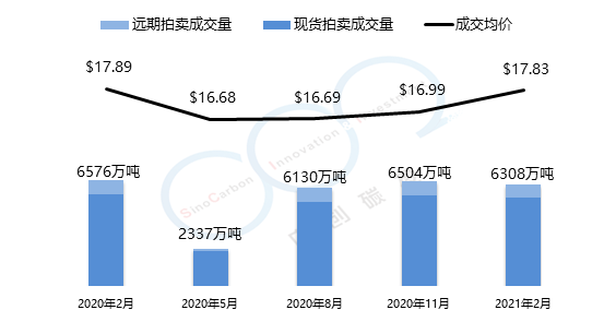 加州-魁北克碳市場(chǎng)的初始配額發(fā)放以拍賣(mài)為主,每個(gè)季度舉行一次拍賣(mài)。2021年2月拍賣(mài)均價(jià)為17.83美元,較上一季度漲幅為5%,總成交量為6308萬(wàn)噸。以下是由中創(chuàng)碳投統(tǒng)計(jì)的加州-魁北克碳市場(chǎng)近一年的交易情況。