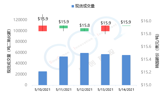 2021年5月10日至5月14日,本周韓國(guó)碳價(jià)在15.9美元/噸上下波動(dòng)。本周韓國(guó)碳市場(chǎng)成交量近25萬(wàn)噸,高于上周22萬(wàn)噸的水平。