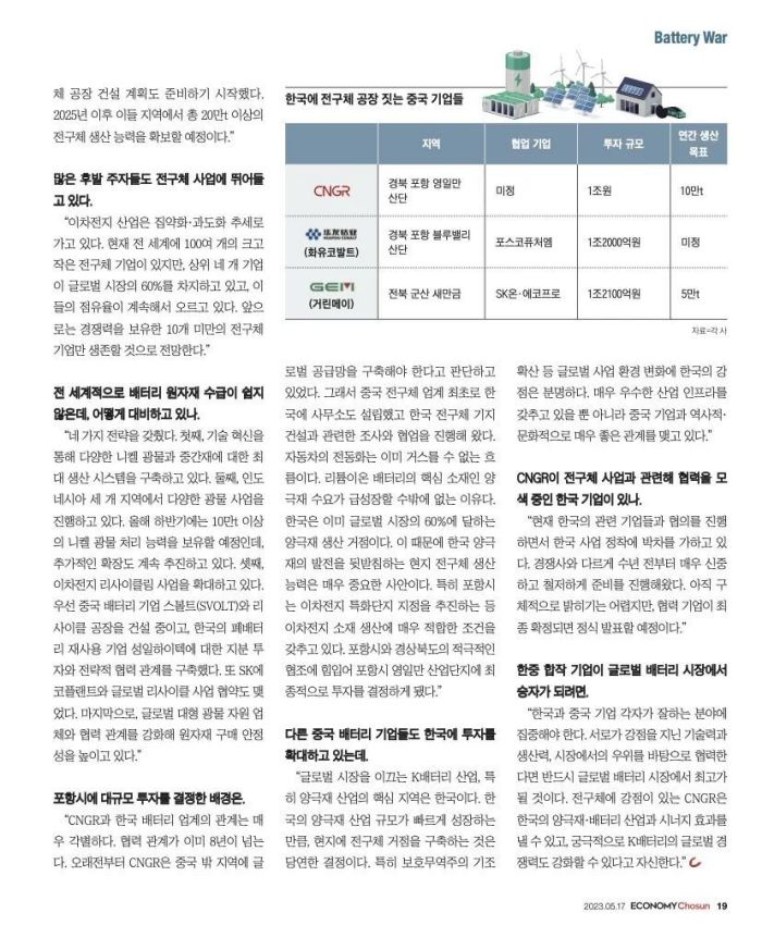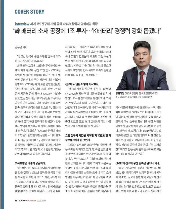 近日,韓國權威經濟周刊《Economy Chosun(經濟朝鮮)》專訪中偉股份董事長鄧偉明,并以“封面故事”刊發在第492期以“電池之戰”為主題的周刊中。