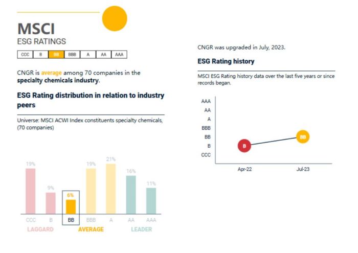 在2023年的標(biāo)普CSA評(píng)分中,中偉股份得分38分,與去年相比提升了10分。值得一提的是,這一分?jǐn)?shù)已達(dá)到入選“標(biāo)普中國(guó)可持續(xù)發(fā)展年鑒”門(mén)檻,代表中國(guó)可持續(xù)發(fā)展標(biāo)桿示范企業(yè)水平。與此同時(shí),中偉股份在明晟的ESG評(píng)級(jí)也由2022年的B等級(jí)提升到了2023年的BB等級(jí),這一評(píng)級(jí)結(jié)果與相關(guān)上下游企業(yè)相比,已處于中間水平。在富時(shí)羅素的ESG評(píng)分中,中偉股份也取得了2.6分的好成績(jī),這一分?jǐn)?shù)已顯著高于行業(yè)平均水平。