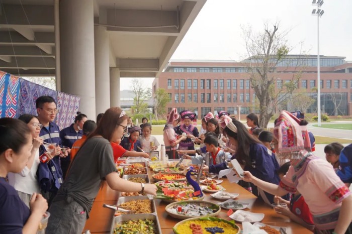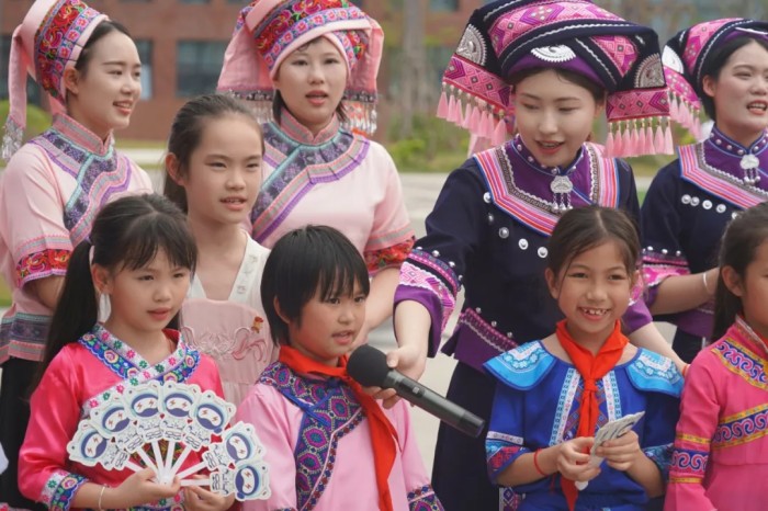 隨著一陣清脆的竹笛聲響起,基地員工、社區居民和學校師生們身著靚麗民族服飾隆重登場,化身“劉三姐”和“阿牛哥”進行山歌對唱。大家以歌言志、以歌會友、以歌傳情,唱響社企共建的優美旋律,讓動聽山歌在新時代的舞臺上煥發出全新光彩。