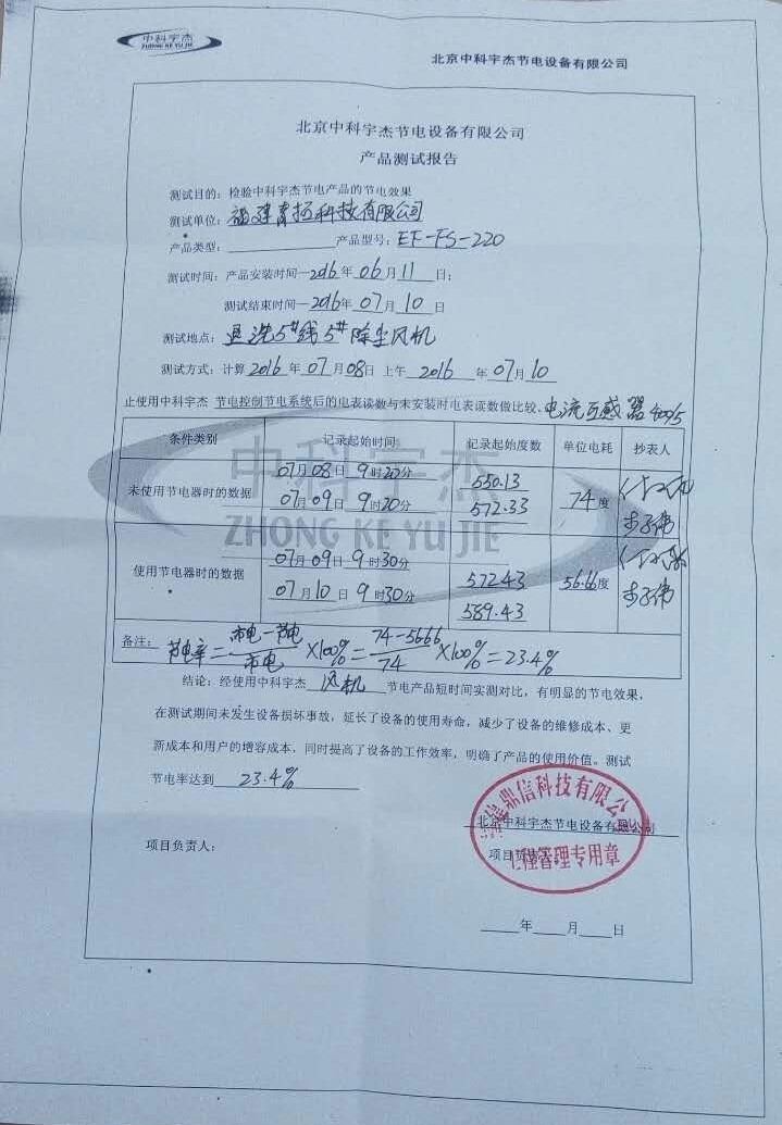 設(shè)備安裝后,經(jīng)過嚴(yán)格的檢驗測試,對比安裝前后的實際能耗情況來看,顯示節(jié)能率達(dá)到23.4%,達(dá)到了預(yù)期的節(jié)電效果。此項節(jié)能項目改造,給用能企業(yè)帶了直接的經(jīng)濟效益。按保質(zhì)十五年計算,此次節(jié)能改造能為用能企業(yè)帶來五百三十三萬人民幣以上直接經(jīng)濟效益。