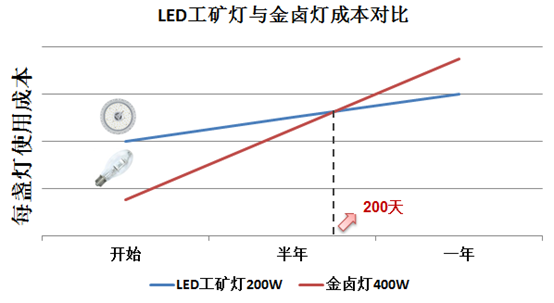 從短期看,金鹵燈的投入比LED工礦燈少。從長期看,LED工礦燈是一種更環(huán)保、節(jié)能的綠色照明產(chǎn)品,而且不到1年的時間內(nèi)將收回全部投入。